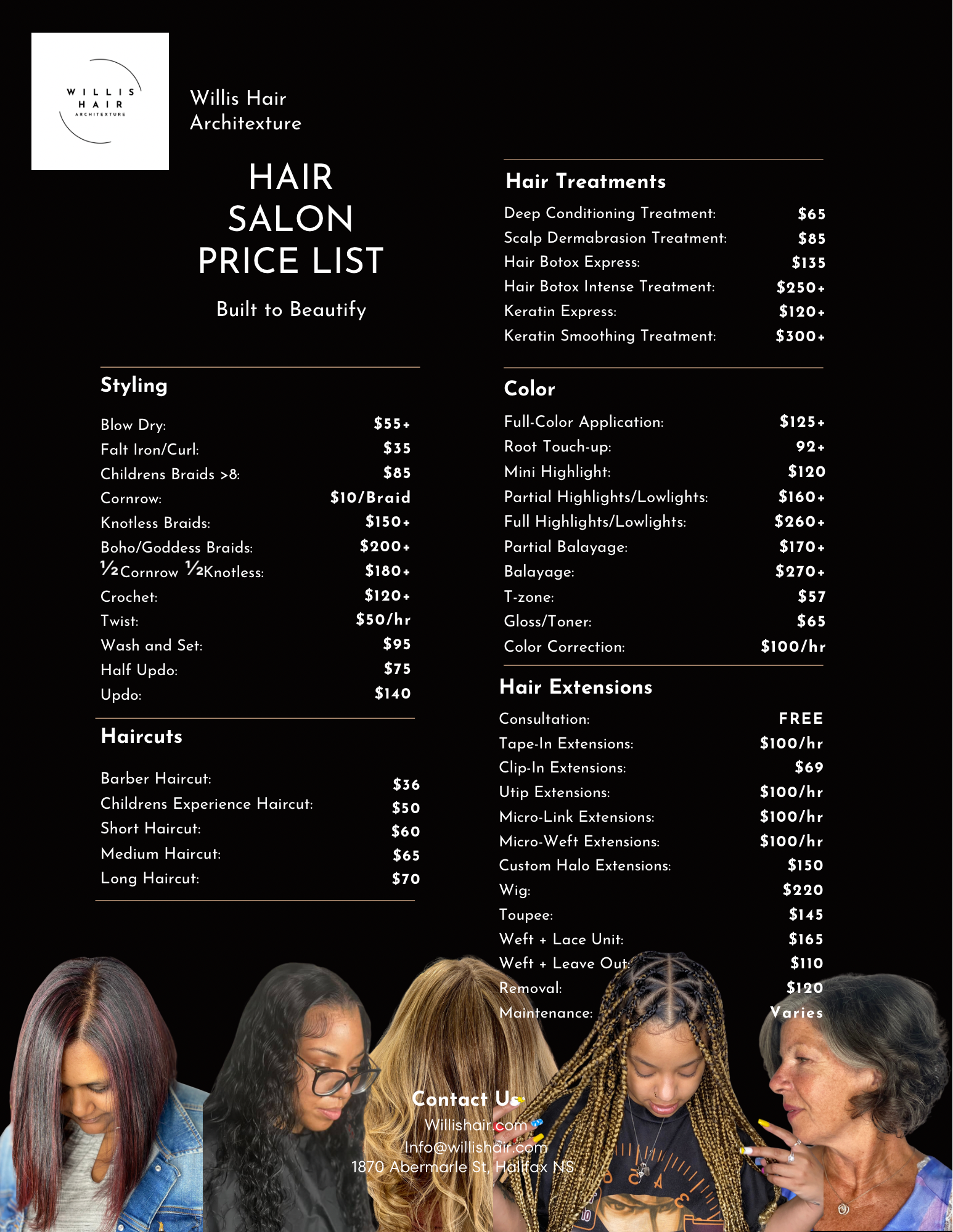 Price list for Willis Hair Architecture, a hair salon. Sections include styling, haircuts, hair treatments, color, and hair extensions. The flyer features images of diverse women with styled hair at the bottom.
